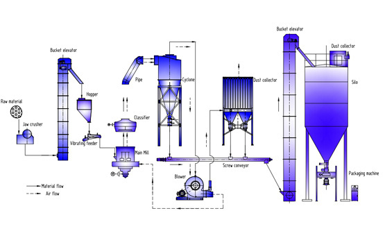 1、破碎階段:大塊物料經(jīng)破碎機破碎到能進入磨粉機的入料細度(15mm-50mm)。
