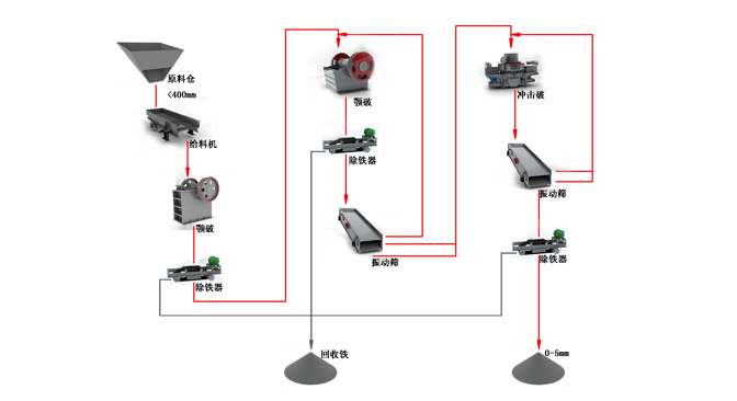 該客戶所建破碎生產線位于云南省一鋼鐵廠附近,用于破碎鋼渣。再生利用主要目的是回收鐵,除鐵后剩余鋼渣供應當地一家磚廠用于制磚。 日運轉:12小時 進 料:經過處理后粒徑小于400mm的鋼渣 成 品:0-5mm