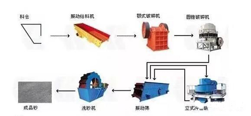 半干法生產(chǎn)是指破碎及破碎前工段無(wú)用水、破碎后工段用水洗,主要適用于我國(guó)南方、水資源豐富或礦石原料中夾雜的粘土料無(wú)法通過干法篩分剔除干凈的地區(qū)。當(dāng)然,北方一些對(duì)機(jī)制砂要求較高的地區(qū)也有選擇濕法制砂。