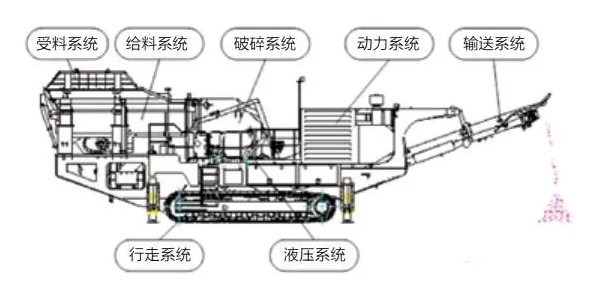 履帶式移動破碎站由受料系統、給料系統、破碎系統、動力系統、輸送系統、行走系統、液壓系統等組成,如圖所示。其中動力系統是履帶式移動破碎站的“心臟”,本文分享幾種常見驅動方式。
