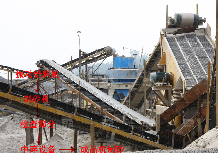制砂:經由破碎后的石灰石石子,一部分作為成品直接送往料堆,另一部分由制砂機進行粉碎、制砂作業;