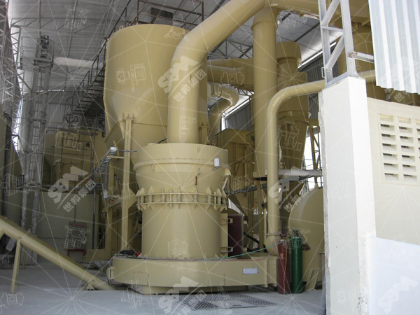 物料經(jīng)過螺旋給料機落在LUM超細立磨磨盤中央,通過主機電機驅(qū)動減速機帶動磨盤轉(zhuǎn)動產(chǎn)生的離心力,使物料向磨盤四周進行均勻移動,當(dāng)物料經(jīng)過磨盤上的輥道區(qū)域時,受到磨輥的碾壓,大塊物料被直接壓碎,較小顆粒受擠壓后形成料床進行顆粒間粉碎。被粉碎后物料繼續(xù)向磨盤邊緣移動,被從進風(fēng)口進入的氣流帶入選粉機進行分級,在選粉機葉片的作用下,不符合粒徑要求的粉體落入磨盤重新研磨,達到標(biāo)準(zhǔn)的粉體通過選粉機隨氣流進入脈沖除塵器進行收集,收集排出的粉體即為成品粉體。物料中混入的鐵塊等雜質(zhì),因難以粉磨且自身重力大,通過磨盤邊緣時,無法被氣流帶走而落入磨機下腔,被刮料板送至吐渣口,排出磨粉機主機外部。