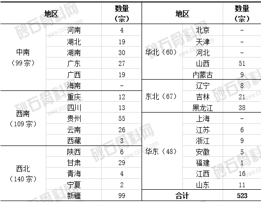 ①2023年上半年,全國共成功出讓砂石類采礦權523宗,較2022年同期上漲13.2%。礦權出讓主要集中在西北、西南及中南等區域,新疆出讓礦權數量占各省份首位。