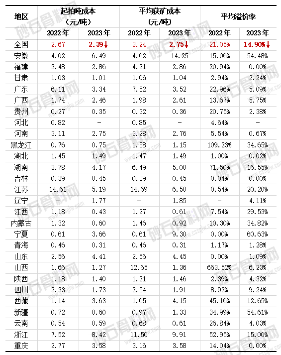 為探究2023年上半年全國砂石類采礦權交易行情現狀,選擇起拍噸成本、平均獲礦成本和平均溢價率三個指標近兩年數值進行分析。