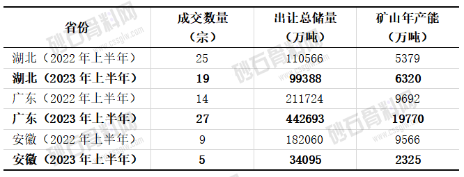 湖北、安徽及廣東等長江、珠江流域的砂石市場一直以來備受關注,為此特選取上述三個省份近兩年上半年的采礦權信息進行簡要分析。