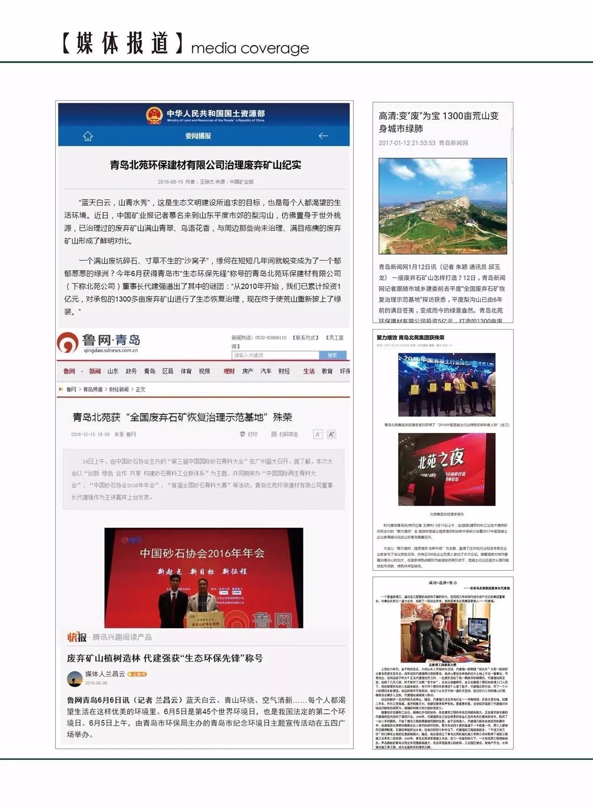 青島北苑環(huán)保建材有限公司位于山東青島平度市,為當(dāng)?shù)貙嵙^強(qiáng)企業(yè),集團(tuán)董事長代建強(qiáng)任青島市砂石協(xié)會會長。公司主營礦山綜合治理、混凝土、工程施工、道路綠化等業(yè)務(wù),在國內(nèi)乃至全球廢棄礦山綜合治理領(lǐng)域成果顯著,多次獲得有關(guān)部委及國家殊榮,是世邦集團(tuán)多年的老客戶。