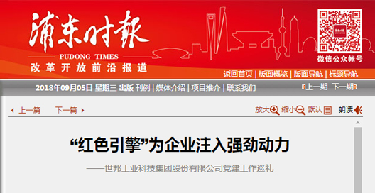 2018年9月7日,浦東時(shí)報(bào)對(duì)世邦集團(tuán)黨建工作進(jìn)行了專(zhuān)題報(bào)道。緊抓黨建工作、團(tuán)結(jié)黨員、緊跟黨走,以創(chuàng)新促發(fā)展,以綠色科技守護(hù)環(huán)境,一路走來(lái),我們成績(jī)斐然。堅(jiān)決擁護(hù)黨的領(lǐng)導(dǎo),讓黨員組成的“紅色引擎”帶動(dòng)公司向更高的目標(biāo)邁進(jìn)。