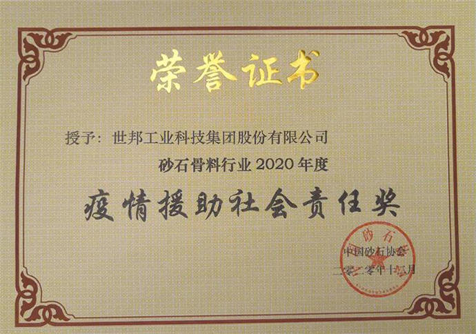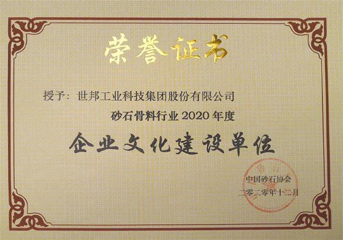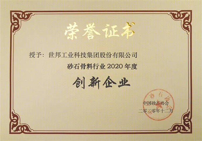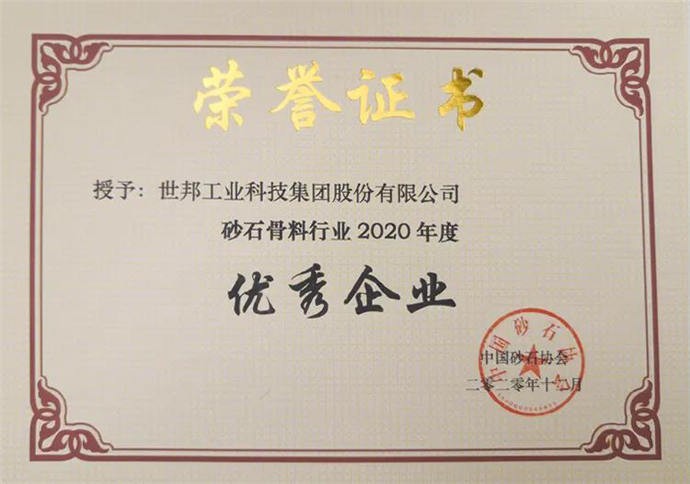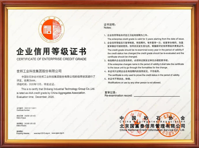 12月14日,中國砂石協(xié)會年會公布2020年度中國砂石行業(yè)企業(yè)信用等級評價結(jié)果,世邦工業(yè)科技集團(tuán)股份有限公司被評為AAA級信用企業(yè)。