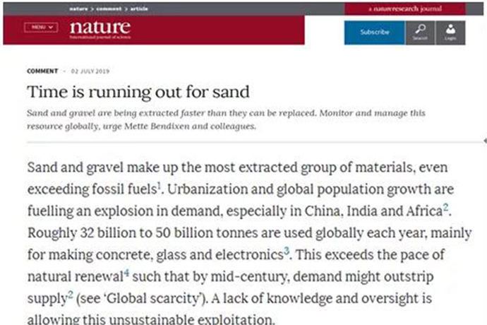 早在2019年,天然砂資源“告急”就已受到國際科技期刊雜志《自然》的報道,報道稱預(yù)計到本世紀中葉(2050年),地球上天然砂資源可能就再也滿足不了人類如此巨大的用砂需求,天然砂資源開采速度過快,天然砂供應(yīng)開始“岌岌可危”。
