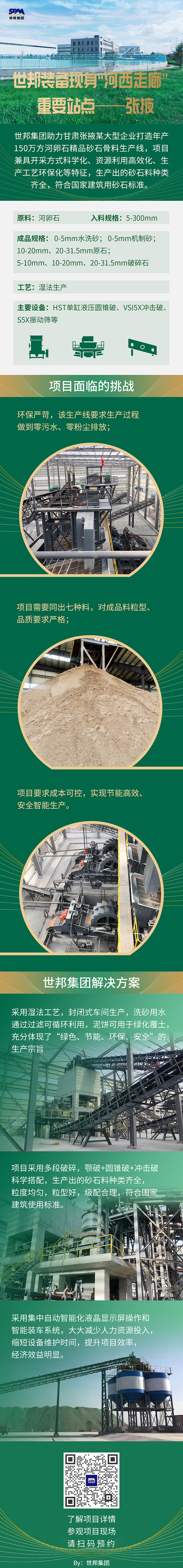 世邦集團助力甘肅張掖某大型企業打造年產150萬方河卵石精品砂石骨料生產線,項目兼具開采方式科學化、資源利用高效化、生產工藝環保化等特征,生產出的砂石料種類齊全,符合國家建筑用砂石標準。