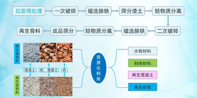 2 環保智能生產工藝,通過分揀、破碎、篩分、磁選、分離、整形等工藝,產出成品料可用作再生骨料、拌和混凝土及制成再生磚,實現變廢為寶