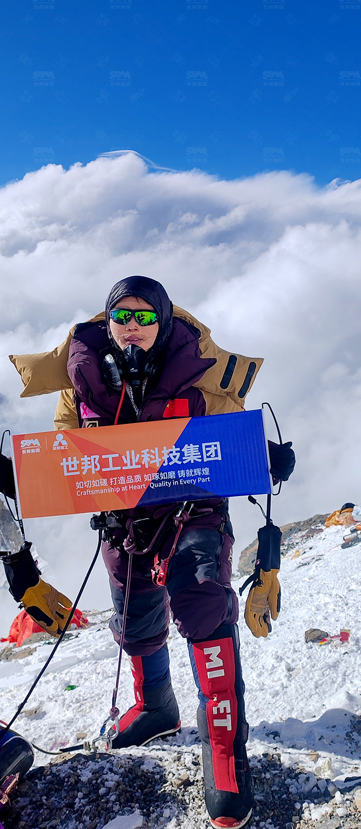 2025年5月24日,河南省首位登頂珠穆朗瑪峰的女性、當代藝術(shù)家孫寧,繼 2019 年、2023 年南坡登頂后再次成功從北坡登頂,耗時6天完成“雙側(cè)貫通”,成為河南首位實現(xiàn)珠峰南北雙登的登山者。第三次站上世界之巔完成了“雪山玫瑰”末了一次由北坡登頂?shù)脑竿诤0?8848.86 米的珠峰峰頂她舉起印有“世邦工業(yè)科技集團”字樣的旗幟,讓攀登者的無畏意志和中國企業(yè)的創(chuàng)新精神,共同在世界理想點迎風招展。