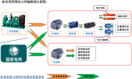 履帶移動站的動力系統采用了油—電雙驅理念,用戶可以根據礦區實際情況選擇柴油發電機驅動,或者直接采用當地電網,徹底解決部分地區偏遠地區設備用電難題,亦可以滿足部分用戶節省燃料費用的需求。