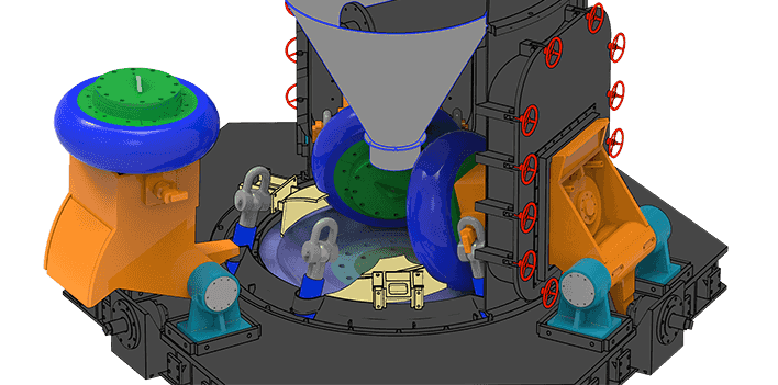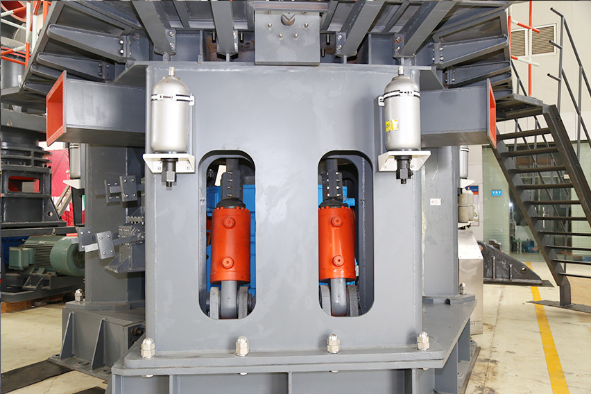 該機(jī)設(shè)計(jì)過程中我們充分考慮重型磨輥可能帶來(lái)的養(yǎng)護(hù)難題,最終開發(fā)設(shè)計(jì)了可翻轉(zhuǎn)結(jié)構(gòu)。該結(jié)構(gòu)配合液壓調(diào)整系統(tǒng),操作員可輕松、快捷的將磨輥翻出機(jī)殼外部進(jìn)行檢修,更換輥套、襯板等養(yǎng)護(hù)操作,減少停機(jī)損失。