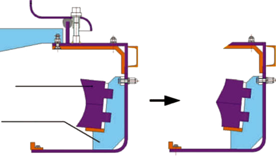 根據生產實際,我們發現周護板多由中部開始磨損,采用一體式周護板的情況下,當中部嚴重磨損時,就需要更換整塊護板,進而增加易損件使用成本;而采用世邦工業改進的分體式設計后,中部磨損后可以上下調頭使用,極大延長了周護板使用壽命,降低易損件成本耗費。