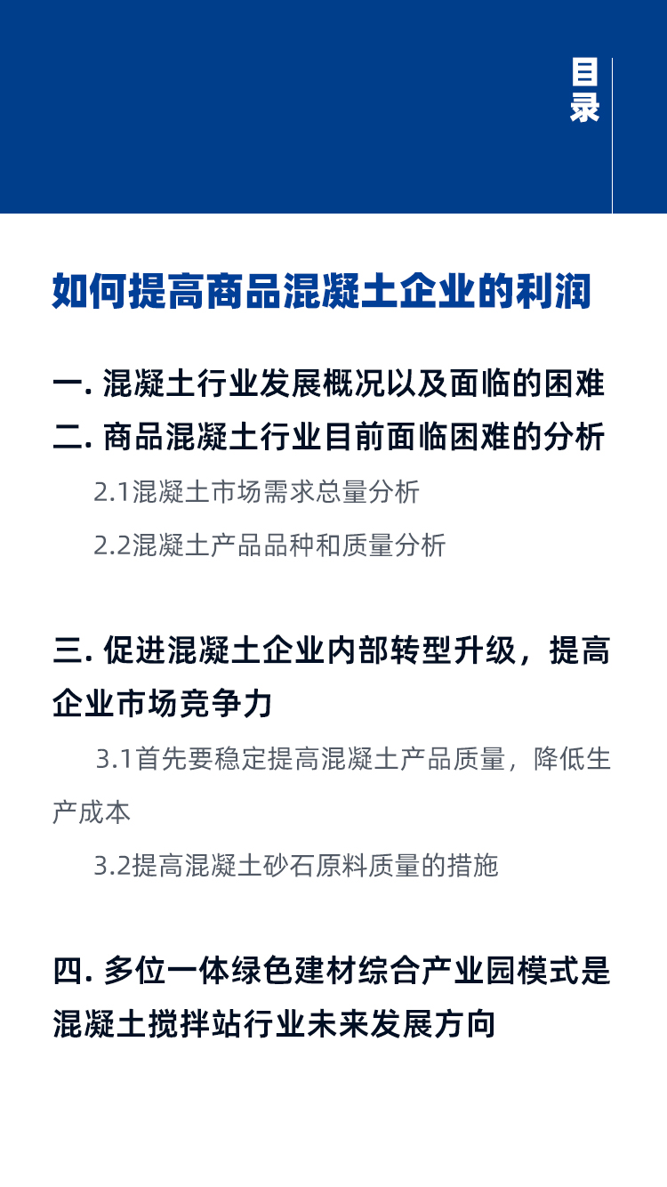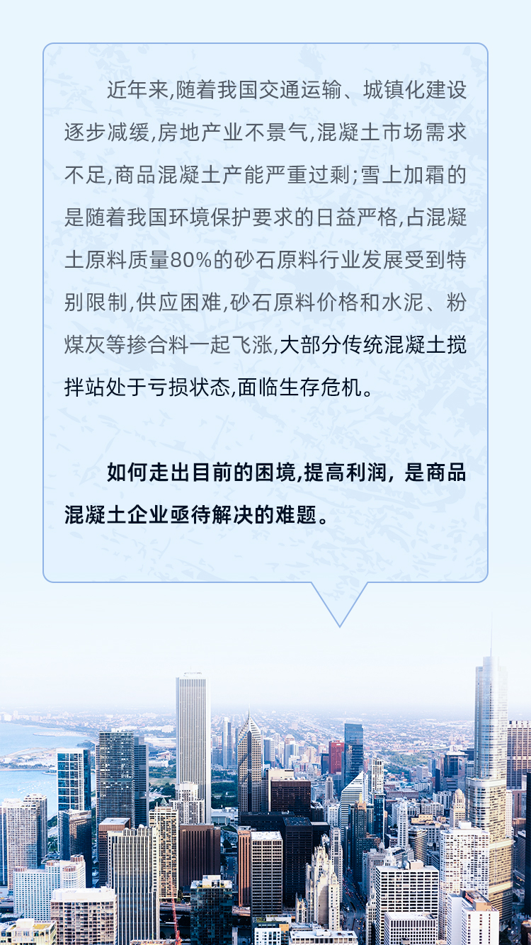 隨著混凝土技術的不斷進步和建筑工程用料要求的逐漸嚴格,部分商品混凝土企業逐漸暴露出如產能落后、產品單一、成品料無法滿足高品質用料需求等問題。那么如何轉型升級?如何提高混凝土企業的利潤?如何適應未來混凝土行業發展?