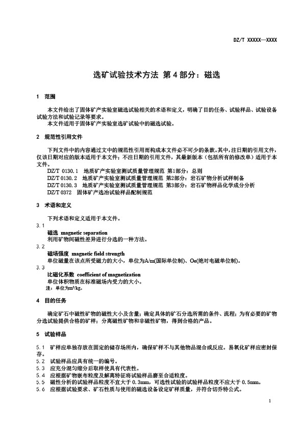 世邦集團(tuán)手機(jī)站本文件給出了固體礦產(chǎn)實(shí)驗(yàn)室磁選試驗(yàn)相關(guān)的術(shù)語和定義,明確了目的任務(wù)、試驗(yàn)樣品、試驗(yàn)設(shè)備試驗(yàn)方法和試驗(yàn)記錄等要求。 本文件適用于固體礦產(chǎn)實(shí)驗(yàn)室選礦試驗(yàn)中的磁選試驗(yàn)。
